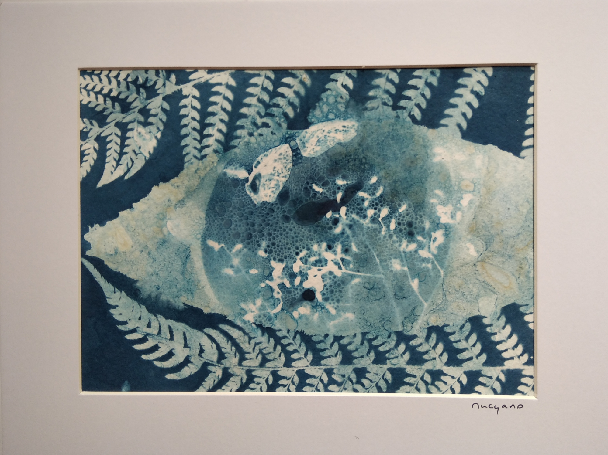 J'utilise un mélange de techniques, dont le procédé du cyanotype humide dans lequel l'exposition au soleil est faite alors que la solution est encore humide sur le papier. Des réactions imprévisibles des éléments utilisés, principalement des végétaux, créent des textures, des couleurs et des motifs spéciaux et uniques!