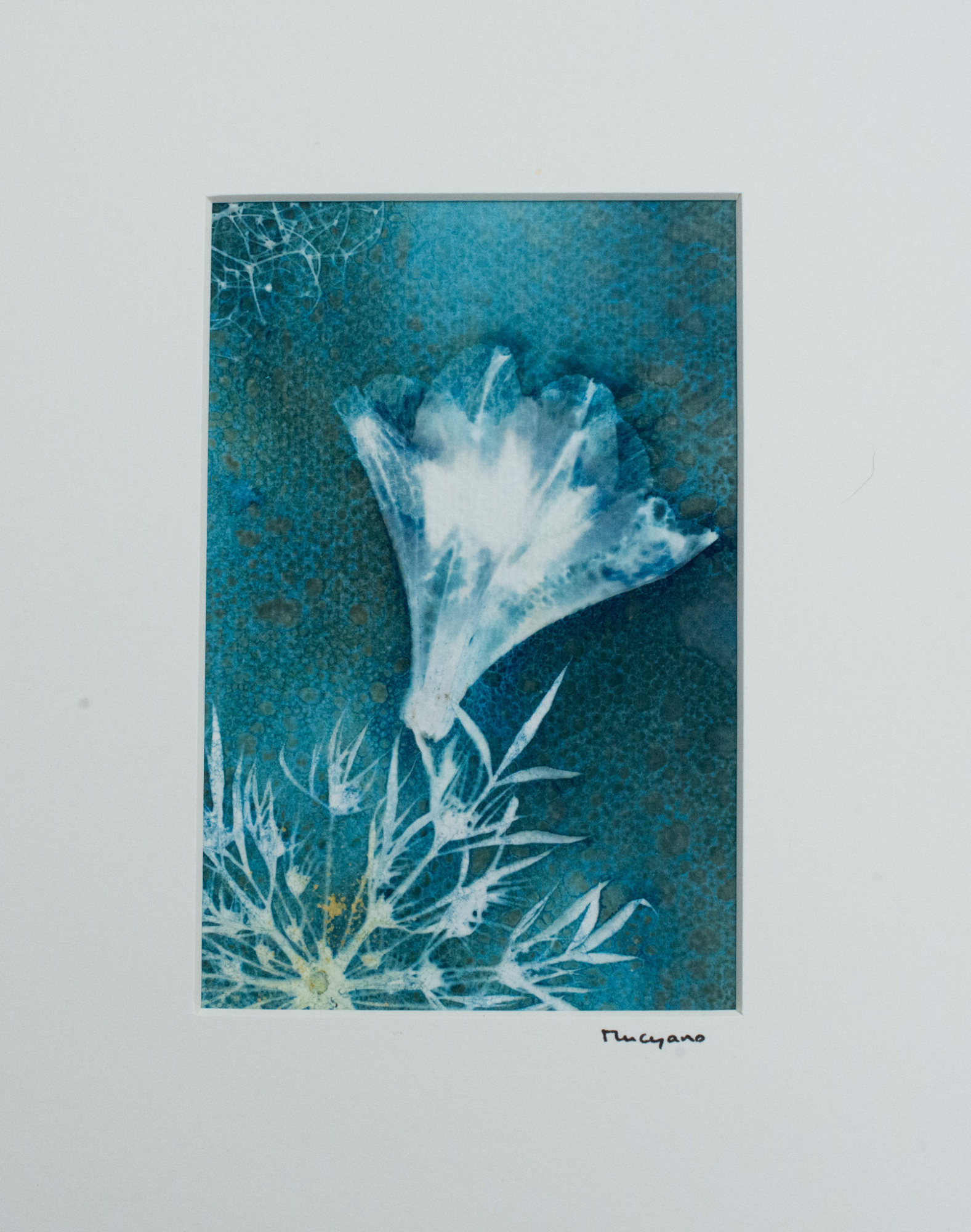 J'utilise un mélange de techniques, dont le procédé du cyanotype humide dans lequel l'exposition au soleil est faite alors que la solution est encore humide sur le papier. Des réactions imprévisibles des éléments utilisés, principalement des végétaux, créent des textures, des couleurs et des motifs spéciaux et uniques!