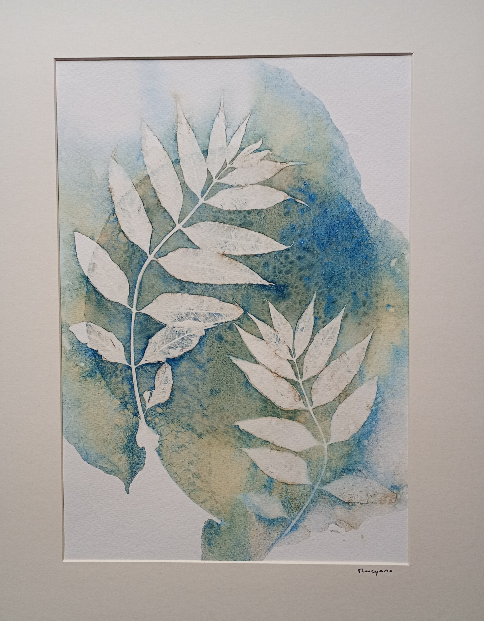J'utilise un mélange de techniques, dont le procédé du cyanotype humide dans lequel l'exposition au soleil est faite alors que la solution est encore humide sur le papier. Des réactions imprévisibles des éléments utilisés, principalement des végétaux, créent des textures, des couleurs et des motifs spéciaux et uniques!