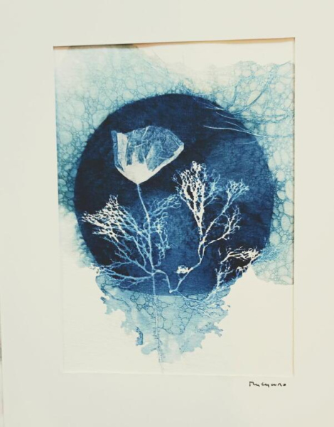 J'utilise un mélange de techniques, dont le procédé du cyanotype humide dans lequel l'exposition au soleil est faite alors que la solution est encore humide sur le papier. Des réactions imprévisibles des éléments utilisés, principalement des végétaux, créent des textures, des couleurs et des motifs spéciaux et uniques!